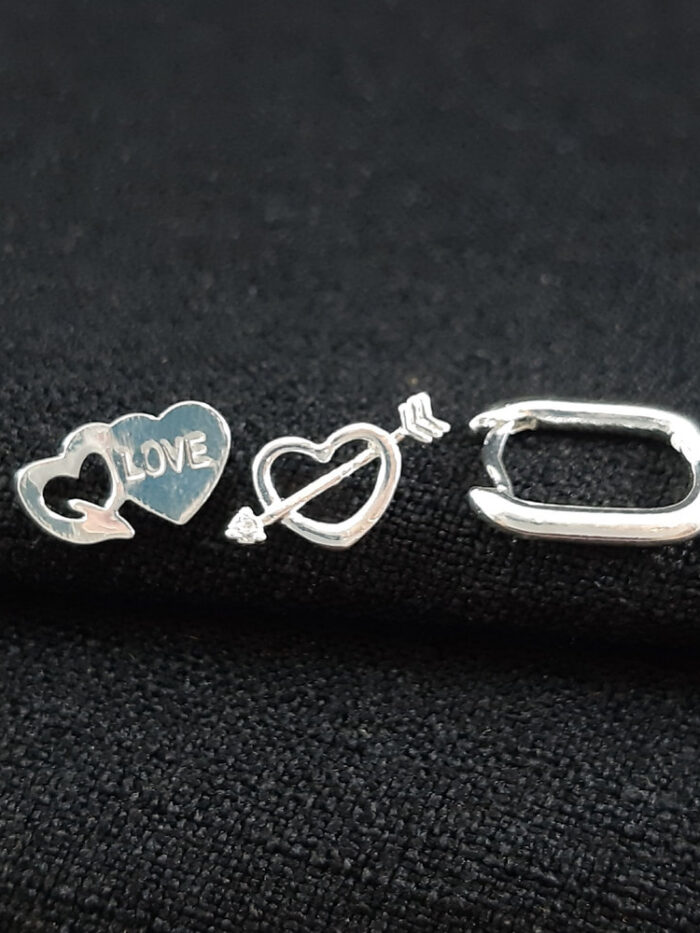 Trio de brincos corações e argola oval prateada