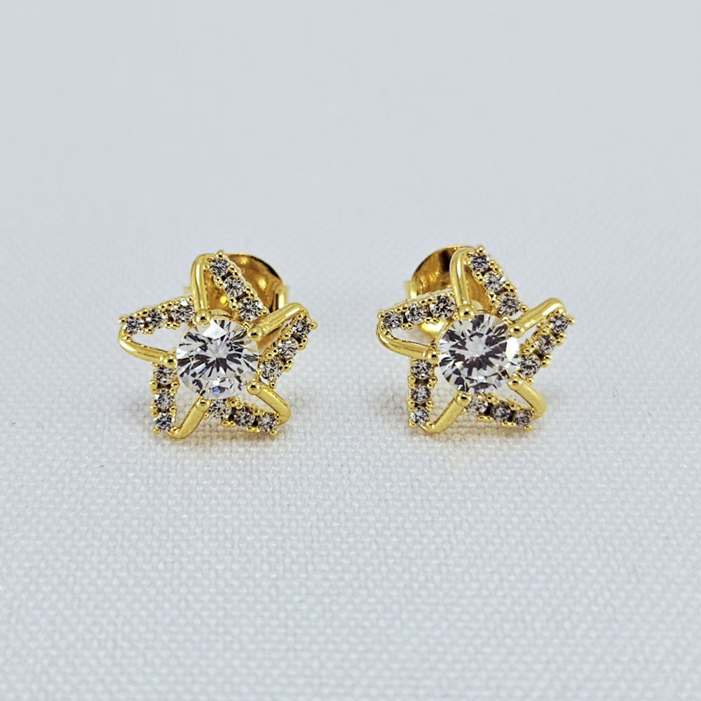 Brinco estilo flor cinco pétalas vazado e cravejado